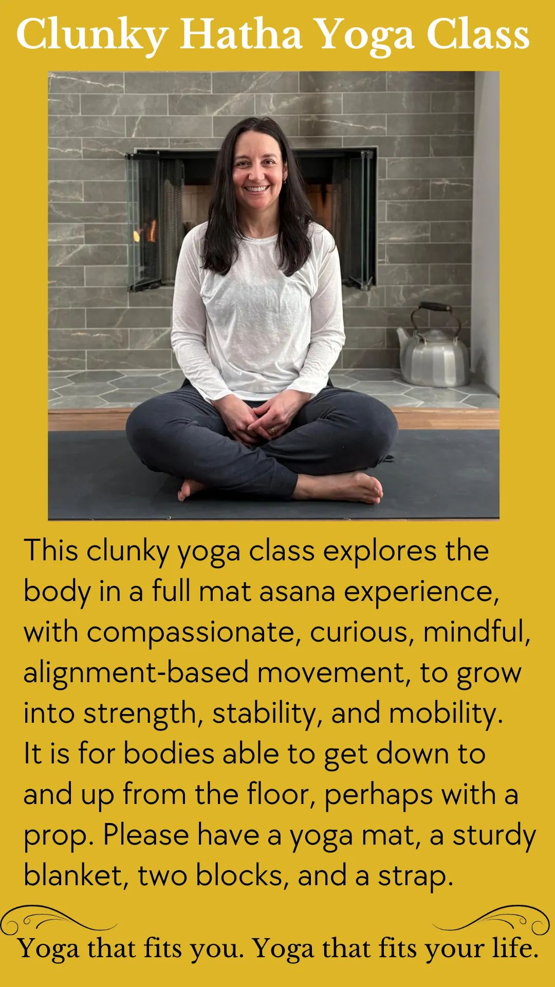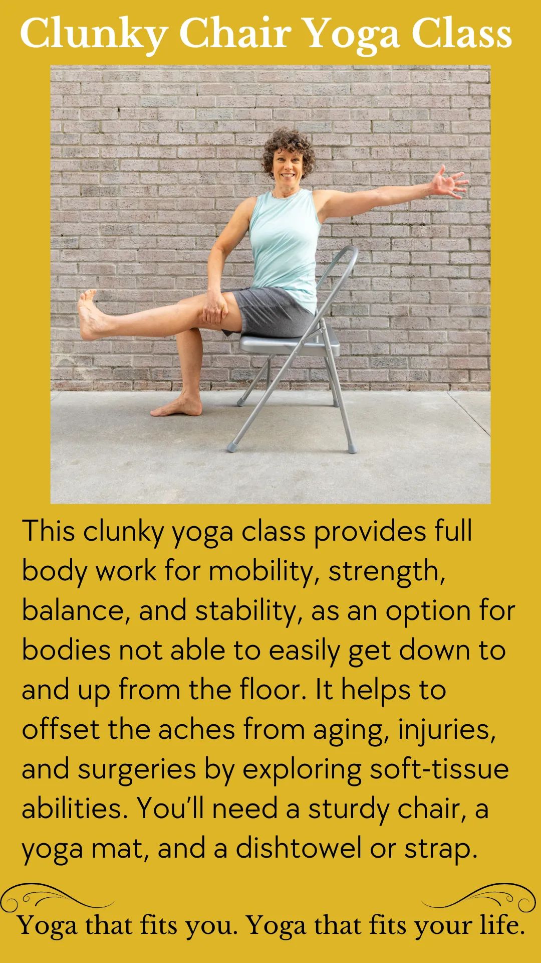 “I liked the class VERY much. I like that your classes make me work hard (mitigated by the fact you make it fun!) while reminding me not to push so hard I hurt myself (the downfall of so many previous attempts to get my body moving). The poses we work on have become more doable (though far from perfect) over the month, and so much has become more doable since I started your online classes last spring. For example, I certainly never expected to be able to squat again in my life or imagined I’d ever do the tree pose. It also gave me the courage to try out other classes, so I’m doing more moving than I had done in years. Your accepting attitude and perspective also add something special to the class. I look forward to the Monday morning class getting me up and my week going. Thanks again.”